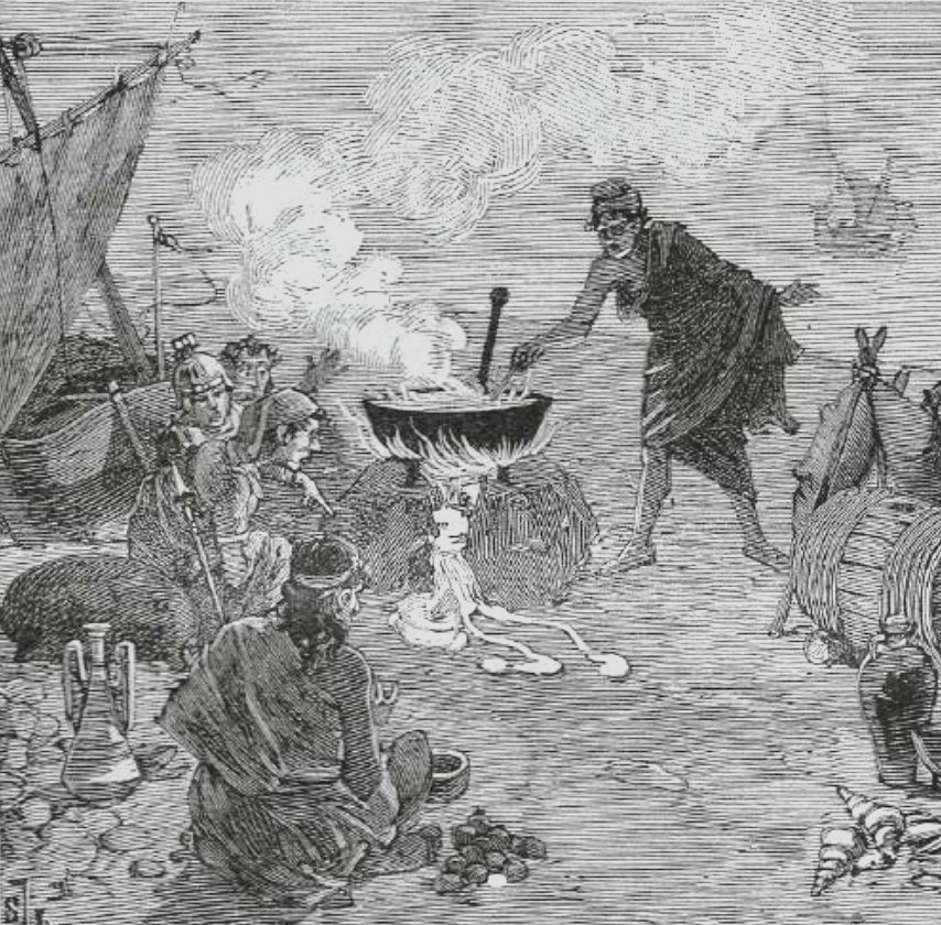 The discovery and history of glass are fascinating tales that date back to antiquity, shrouded in a veil of mystery and legend. The romanticized story told by Pliny the Elder, in his book [4] “Natural History”, tells of Phoenician merchants who, in search of stones to support their cooking pots, used natron [5], a stone made from sodium carbonate, to raise their vessels (Figure 5) while cooking their food. Under the effect of fire, natron mixed with sand from the Belus river shore produced an unknown material, flowing in transparent streams. Thus, according to legend, was born glass.