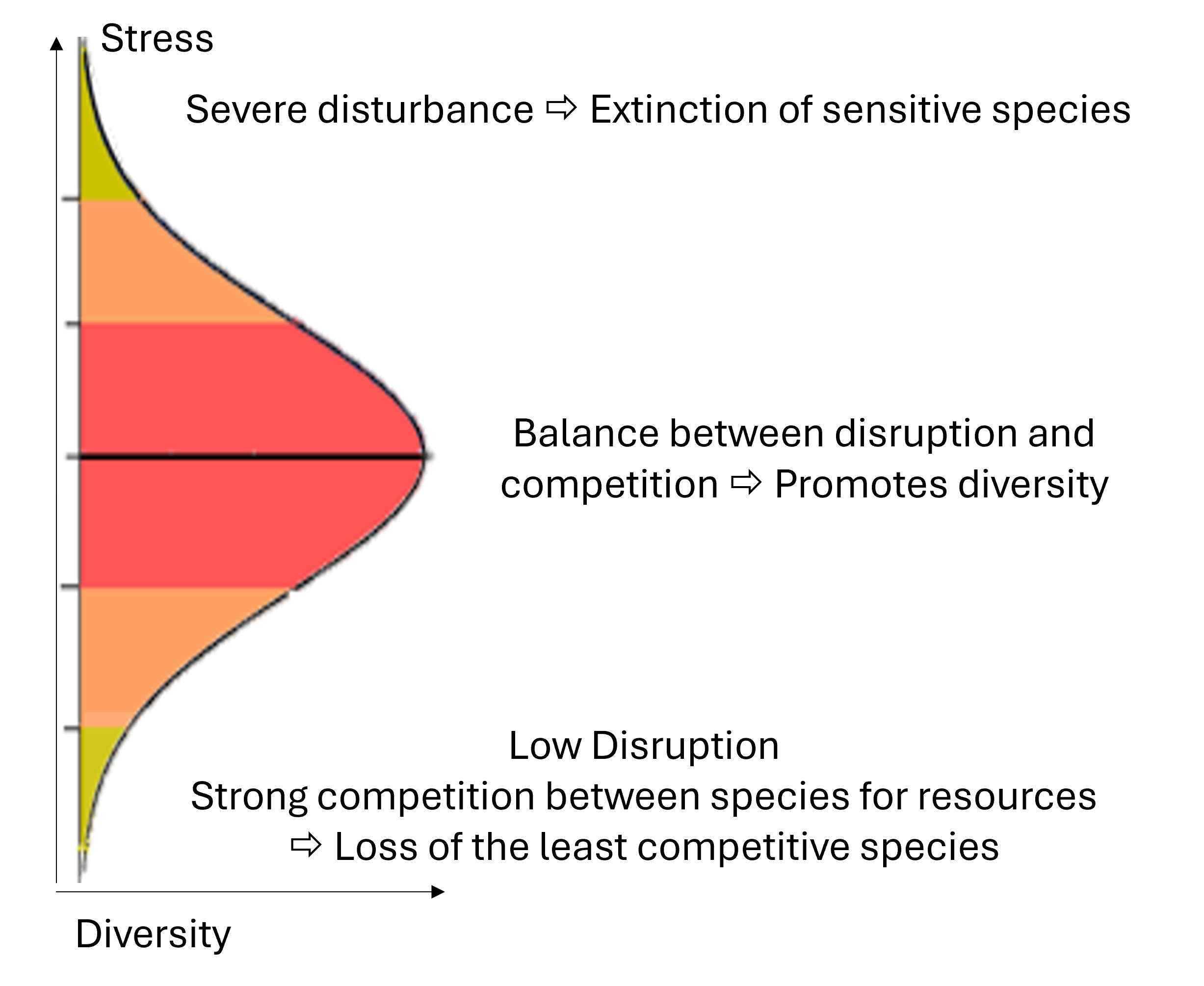 This is explained by the ecological concept known as ‘intermediate disturbance’, which links an ecosystem’s level of diversity to the intensity of the disturbances to which it is exposed, with maximum diversity occurring in moderately disturbed systems (Figure 5).