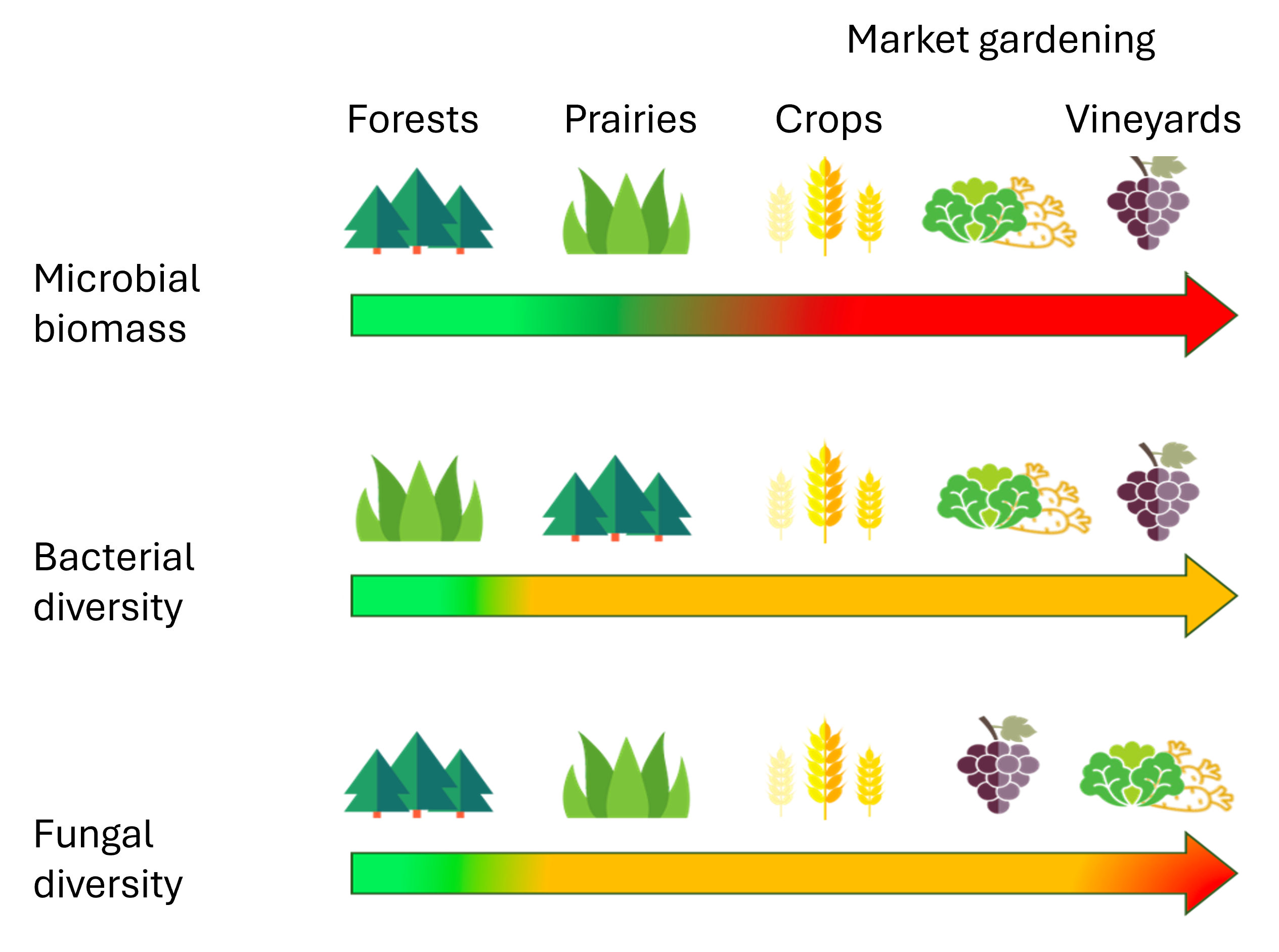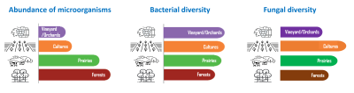 - Soils under grassland and forests harbour a greater amount of microorganisms than those under arable crops or vineyards and orchards.