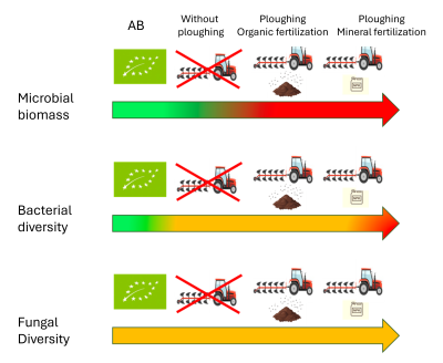 - In agricultural soils, the lower microbial biomass can be explained by various agricultural practices such as (i) the absence of permanent vegetation cover (crop rotation without catch crops, vineyards without grass cover), (ii) tillage, (iii) fertilisation with chemical fertilisers at the expense of organic inputs, and (iv) the application of biocides such as pesticides.