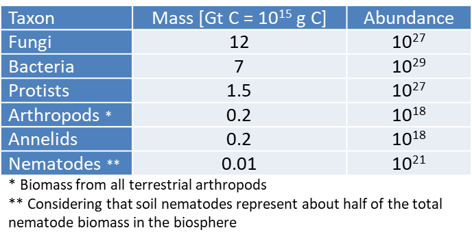Table 1. Distribution of biomass according to groups of living things in soils. (expressed in Gt C). Of course, the carbon contained in living organisms represents only a fraction of the carbon in soil organic matter (litter, etc…). [Table based on data from Bar-On et al. ref [4]; Open access article distributed under CC BY-NC-ND 4.0 license]