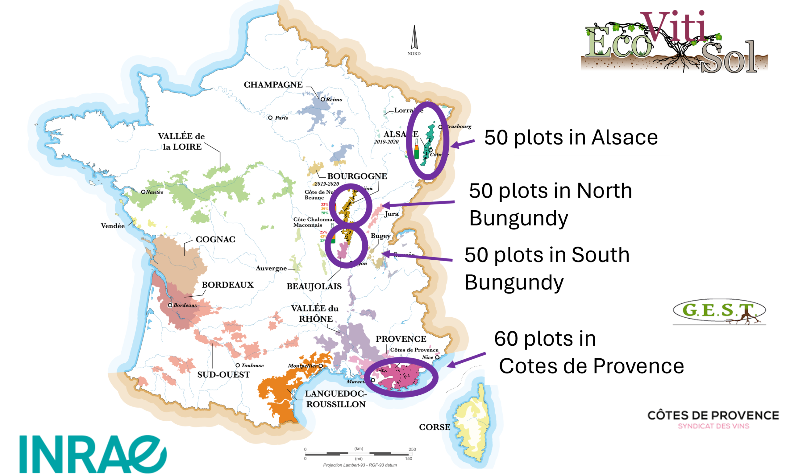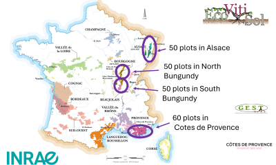 This initiative is based on a fruitful collaboration between researchers specialising in (i) soil microbiological quality (INRAE Dijon), (ii) soil carbon (CNRS ENS Paris) and key regional stakeholders to establish a network of winegrowers (the GEST association and BIVB in Burgundy, INRAE Colmar and GIEE in Alsace, and the Côtes de Provence winegrowers’ association in Provence).