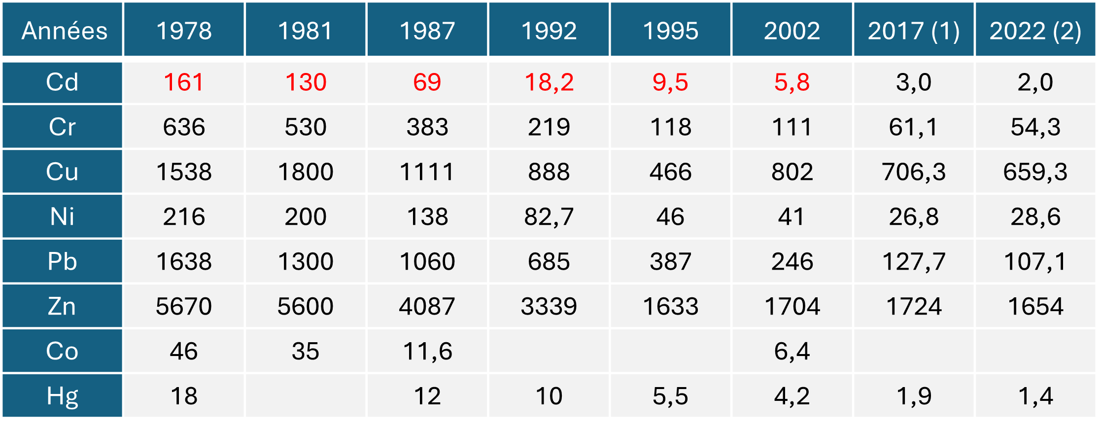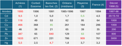 Table 2. Variability over time. Analyses of sludge from the Achères wastewater treatment plant (Seine Aval). Figures expressed in mg/kg of dry matter. (1) Weighted averages of 52 weekly analyses. (2) Content measured weighted by the dry matter tonnage of the corresponding batch. © Denis Baize