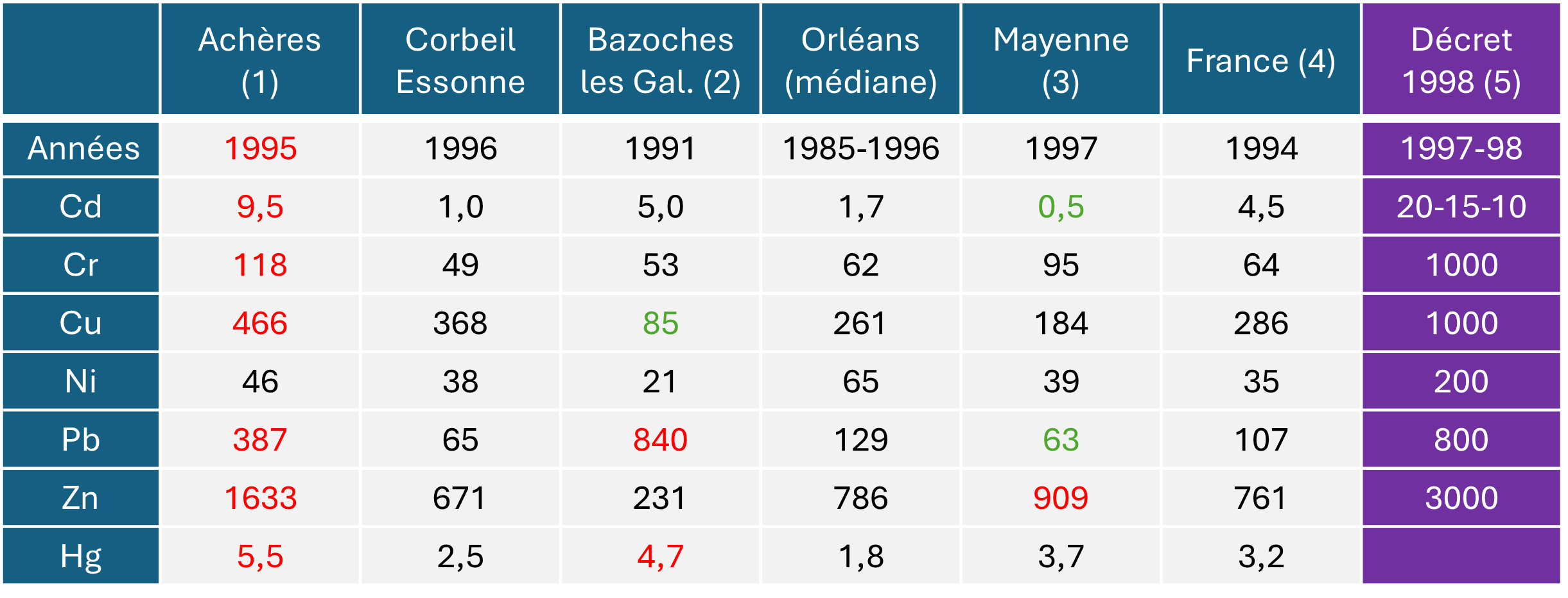 (1) Achères = Seine Aval plant, Paris metropolitan area. (2) Bazoches-les-Gallerandes is a small rural village in Beauce where there is a battery recycling plant. (3) City of Mayenne. (4) Median of 237 predominantly domestic plants in 1994 (source: ADEME). (5) The maximum authorised  cadmium content of sludge was rapidly reduced from 20 to 10 mg/kg in just a few years. © Denis Baize