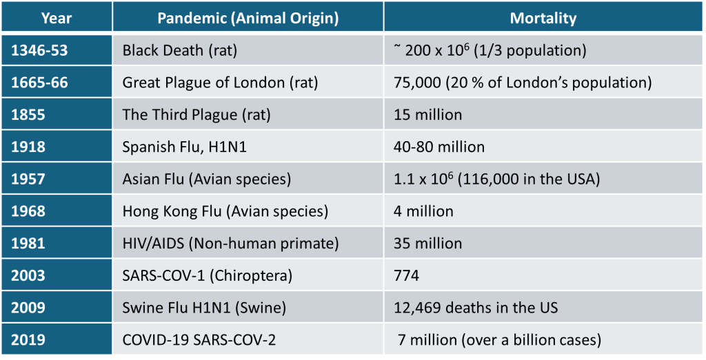 There are now more than 150 zoonotic diseases in the world, a dozen of which alone are responsible for 2.2 million deaths per year. While there are more than 5000 viruses identified (while more than 320,000 are expected by research), only a little more than 200 species of viruses have been recognized and identified as capable of infecting humans. Of these viruses, 62% are of animal origin, and most are derived from wildlife (Tables 1 and 2).
