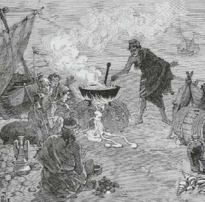 La découverte et l’histoire du verre sont des récits fascinants qui remontent à l’Antiquité, enveloppés dans un voile de mystère et de légende. L’histoire romancée rapportée par Pline l’Ancien, dans son ouvrage [4] « Histoire Naturelle« , évoque des marchands phéniciens qui, à la recherche de pierres pour soutenir leurs marmites, utilisèrent du natron [5], une pierre faite de carbonate de sodium, pour élever leurs récipients (Figure 5) pendant la cuisson de leurs aliments. Sous l’effet du feu, le natron mélangé au sable du littoral du fleuve Belus produisit un matériau inconnu, coulant en ruisseaux transparents. Ainsi, selon la légende, serait né le verre.