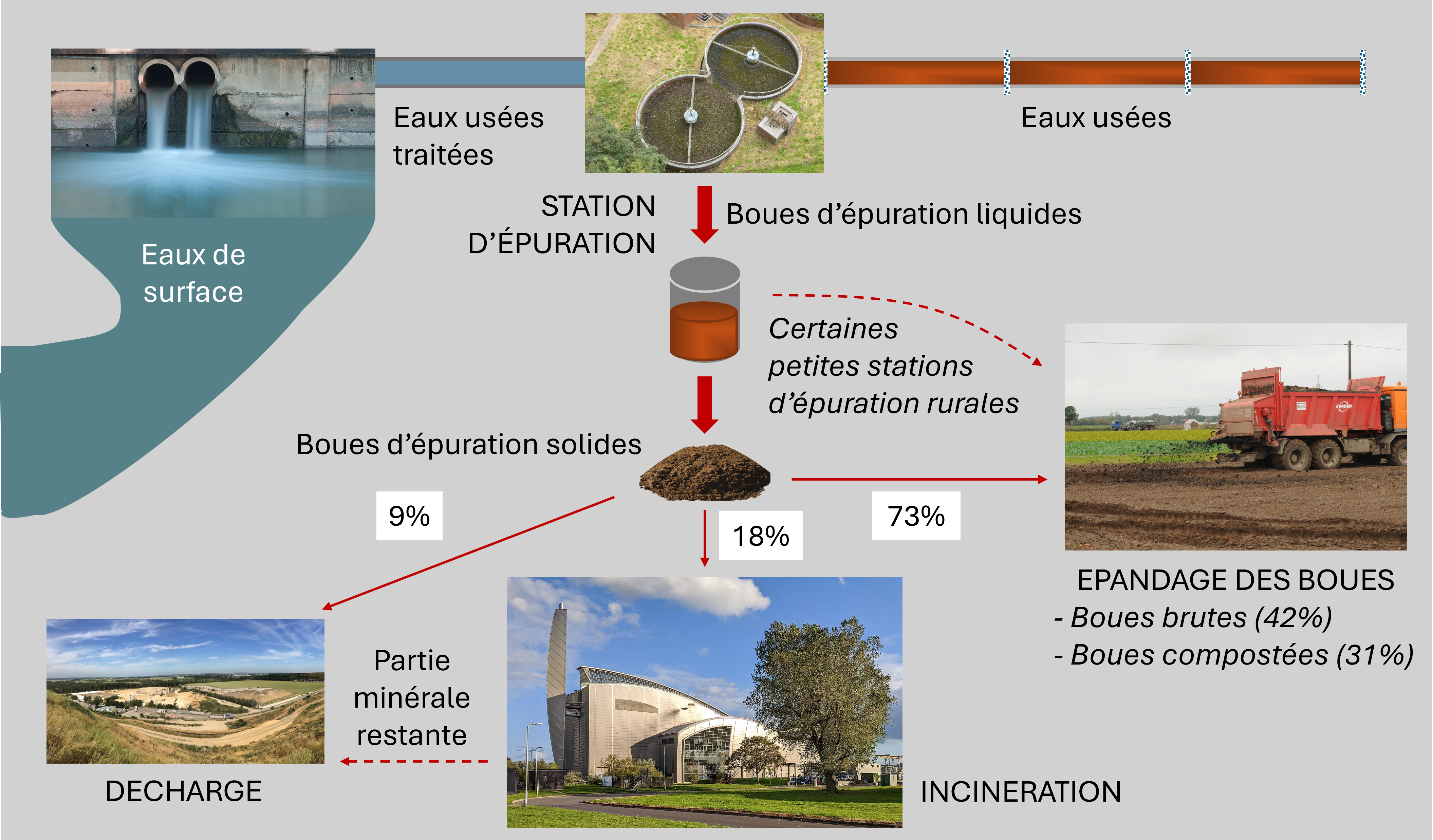 Le reste des boues issues des stations d’épuration françaises est incinéré (18 %) ou envoyé en décharge (9 %), cette dernière filière étant une option « de secours ».