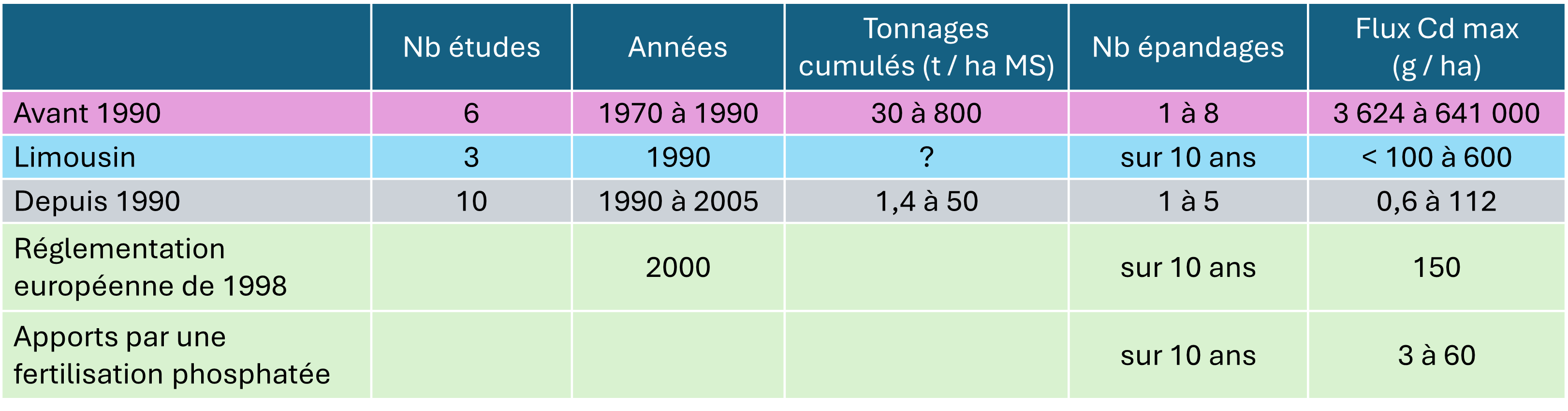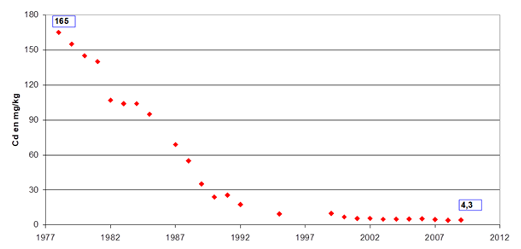 - Décennies 1970 et 1980 : épandages excessifs de boues urbaines très chargées en cadmium.