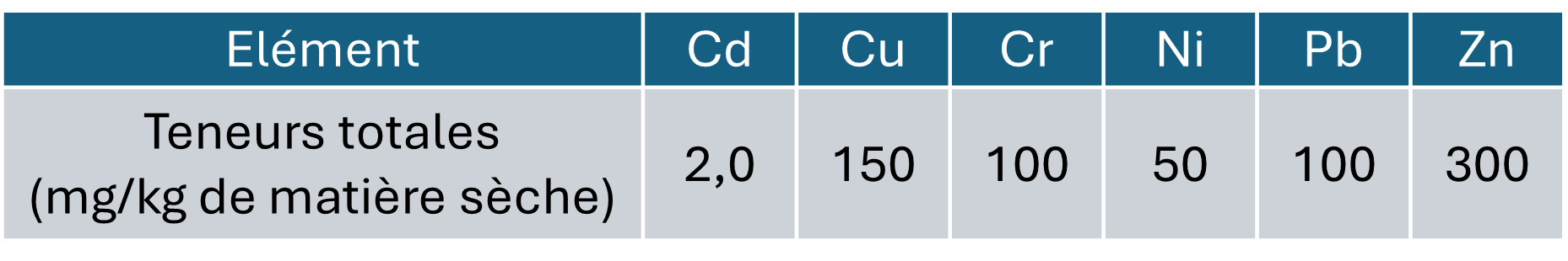 Tableau 1. Valeurs seuils en six éléments traces métalliques pour les « sols » (en réalité pour les horizons de surface labourés des terrains où on envisage d’épandre). Teneurs totales exprimées en mg par kilo de matière sèche (mg/kg MS).