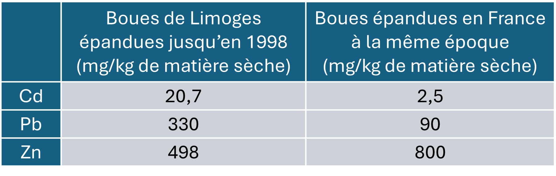 Tableau 3. Teneurs moyennes en ETM dans les boues de Limoges comparées à celles épandues en France à la même époque (expression en mg/kg de MS) © Denis Baize