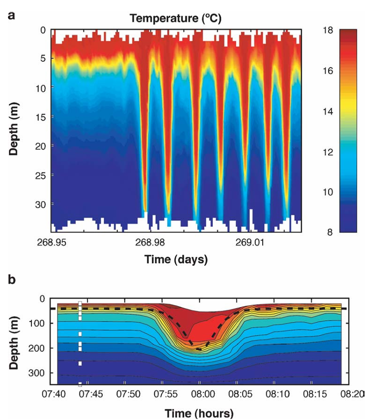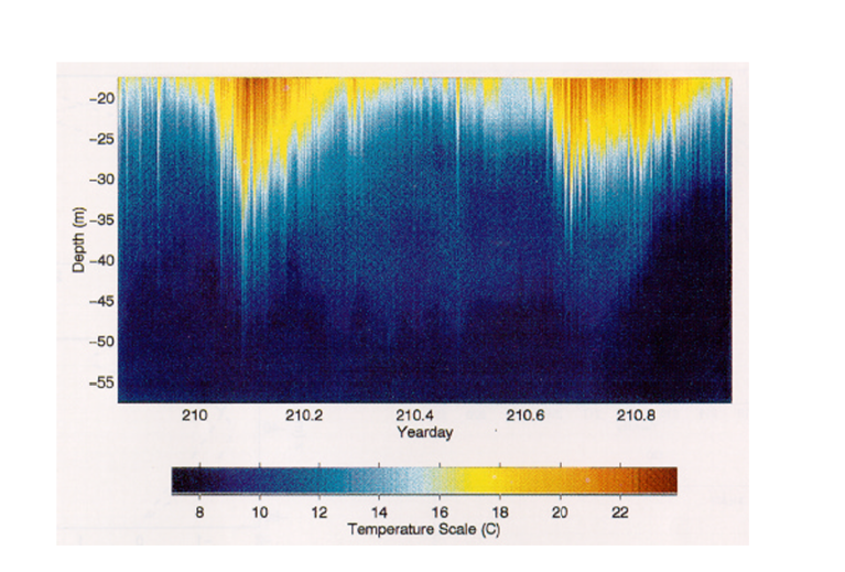 随着探测精度的提高,在温跃层和深水中还发现了水平延伸2~20 千米、厚度为2~10米的层状微结构。这种锯齿状微结构层的形成机制还有待进一步地探讨。不同水团之间的相互作用和小尺度内波的破碎可能是形成层状微结构的原因。