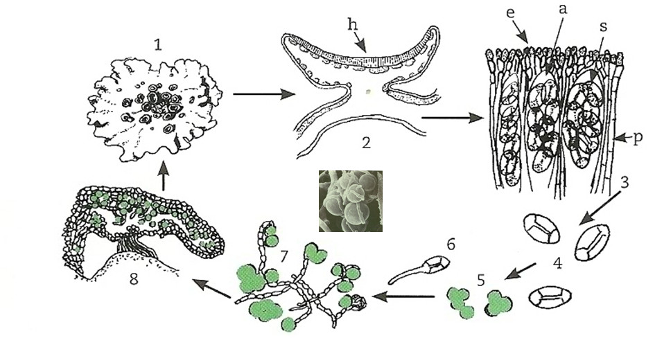 成熟后,孢子从子囊中猛烈地排出,落在基质上发芽后形成菌丝。为了使地衣恢复,这样形成的菌丝体必须与单个藻类相遇。这样一来,一个新的地衣体可以产生,并长成一个成年的地衣体,这种共生关系便可以逐渐恢复。