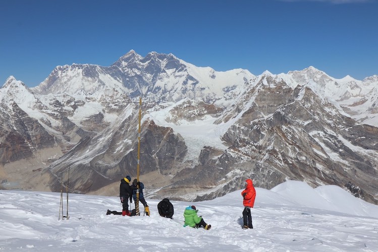 为具体说明,以位于尼泊尔珠穆朗玛峰以南约30公里处的玛拉冰川为例。玛拉冰川自2007年起持续开展物质平衡监测。图3展示了部署在该冰川上的观测网络:玛拉冰川发源于海拔6500米的同名山峰,延伸至海拔4900米的前沿。