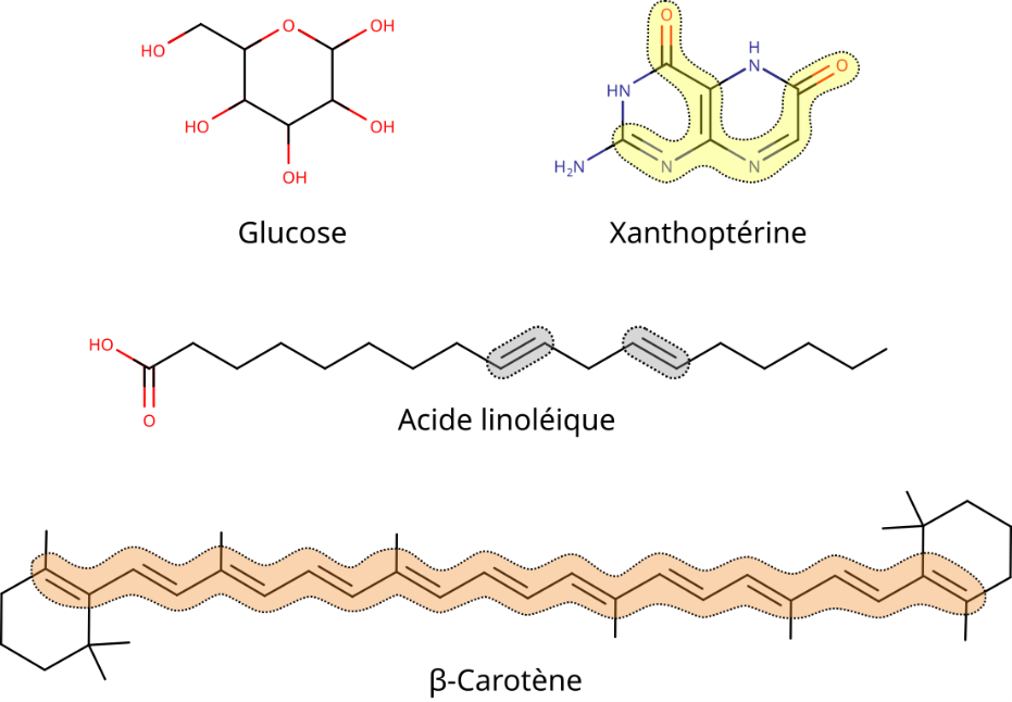 所有分子都与电磁辐射(即光,范围从高能伽马射线、X射线到低能无线电波)相互作用。但并非所有分子都显色,因为人眼仅能感知可见光波长(400至700纳米)。在生物界,有机分子主要吸收远紫外线波长(100至300纳米),绝大多数在我们看来是透明的;这一普遍特性也解释了为何生物体分子易被这些能量较高的波长降解(就DNA而言可能导致突变)。