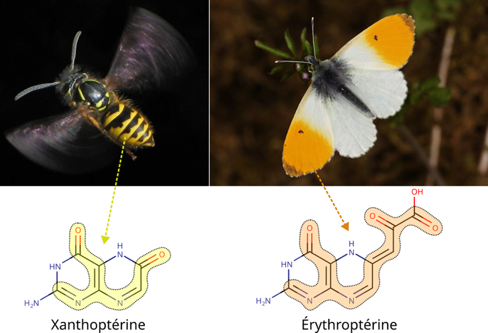 使色素显色的特性也决定了其不同色调。实际上,上述任一参数的变化都可能导致色素电子吸收不同波长的光。我们感知的色素颜色是其吸收色的补色,这意味着吸收紫光的黄蝶呤(黄蜂黄条纹)与吸收蓝光的红蝶呤(奥罗拉蝶橙斑;图3)呈现不同色彩。