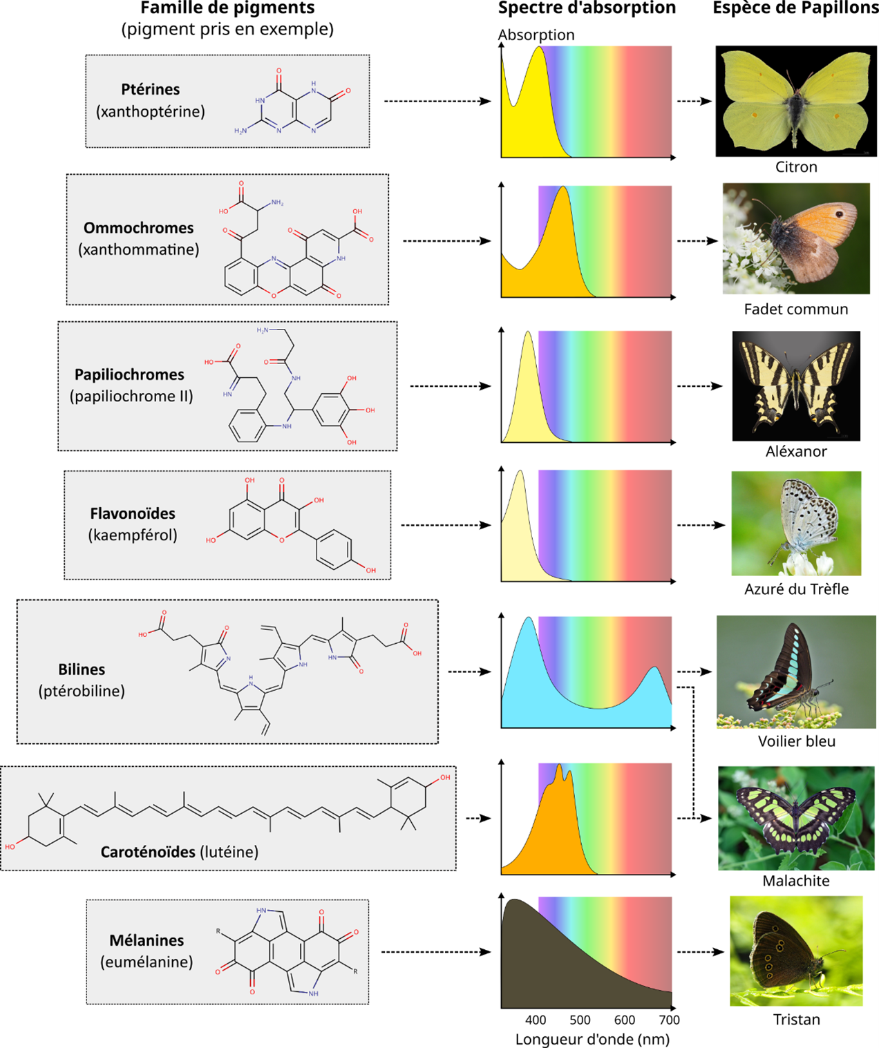 [1] 从生物化学角度看,色素可直接来源于食物(例如源自植物叶绿素的绿色胆色素、完整保留的植物类黄酮或由生物体自身代谢产生(例如黑色素、蝶呤和眼色素/凤蝶色素分别由酪氨酸、鸟嘌呤和色氨酸等氨基酸或核酸碱基合成)。