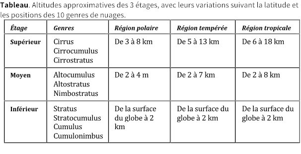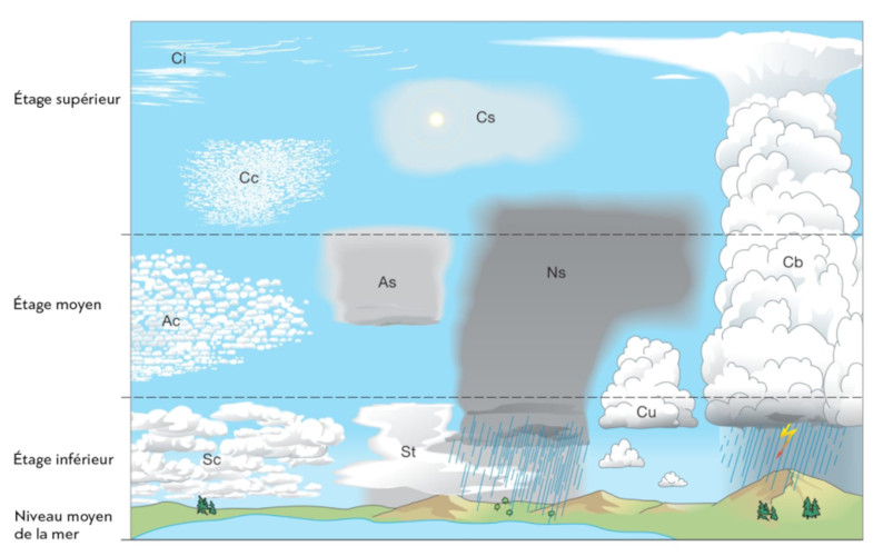 Chaque genre de nuages se situe dans un intervalle d’altitudes assez bien défini, dénommé étage, et n’en sort pas, même si certains peuvent chevaucher deux étages (voir la Figure 1). C’est en particulier le cas des Cumulonimbus (Cb), qui conduisent à la formation des orages et dont la structure en enclume peut culminer à des altitudes proches de 10 km, et les Nimbostratus (Ns), qui peuvent produire d’abondantes précipitations. On distingue habituellement 3 étages pour situer leurs altitudes approximatives, lesquelles varient de façon assez significative avec la latitude.